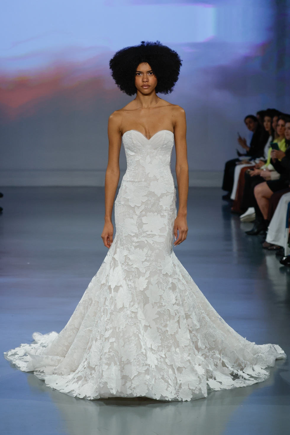 "In this digital age of algorithms, AI, and an abundance of screens, I wanted to explore the expression of my imagination and the very essential human aspect of creativity amplified by modern technology, blending the two worlds as seamlessly as possible. It was our goal to use technology as a tool to enhance the viewers’ experience, so we designed an immersive environment utilizing projection mapping to showcase our collection of gowns that celebrate heritage craft and construction" said Ines Di Santo about her latest bridal collection.