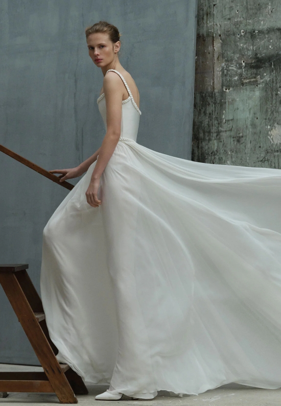 From fluid tulle spaghetti straps that mimic marble to strapless sheaths that echo statues in silk, each piece blurs the line between fashion and art. Every look evokes both structure and softness, offering brides the ability to float, glide, and command every step of their day.