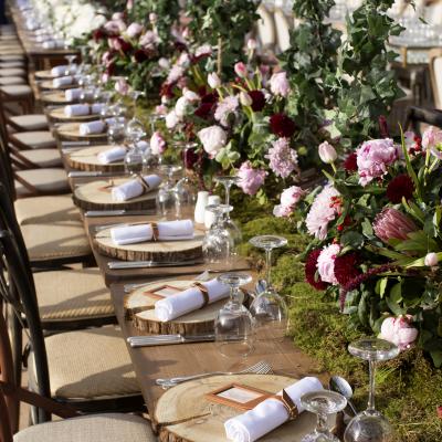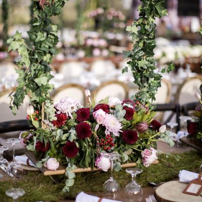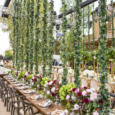 وتمحور ثيم ديكور حفل الزفاف حول الطابع الريفي، البوهيمي والسفر. استلهم فريق العمل الديكور من محطات القطار القديمة في جميع أنحاء العالم، ليتماشى مع موضوع السفر. وكانت الألوان المستخدمة الأخضر والأبيض والوردي والأحمر.