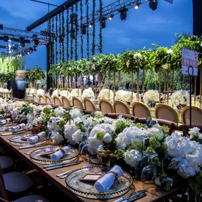 بالنسبة للمدخل، سار الضيوف عبر نفق رائع مستوحىً من مترو أنفاق لندن. ولإضافة لمسات توحي بمحطة القطار، عمل فريق العمل من ماي إيفينت ديزاين على تثبيت ممر يصل طوله 12 متر، وكان محاطاً بالبوليكاربونات لكسان وإضاءة LED على شكل قوس دائري. ولإضافة أجواء أنيقة، تم تركيب أواني من الكريستال الجميلة في صف واحد على السقف، وأضافوا أطواق الأزهار إلى السطح الداخلي للنفق.
