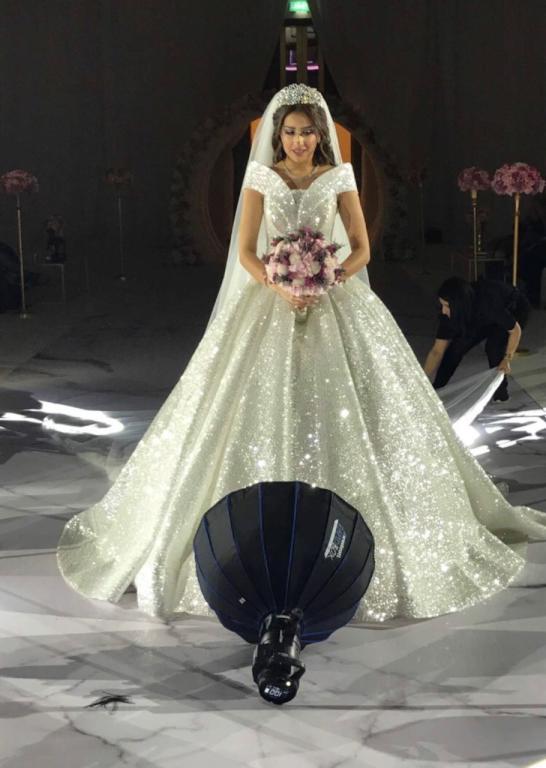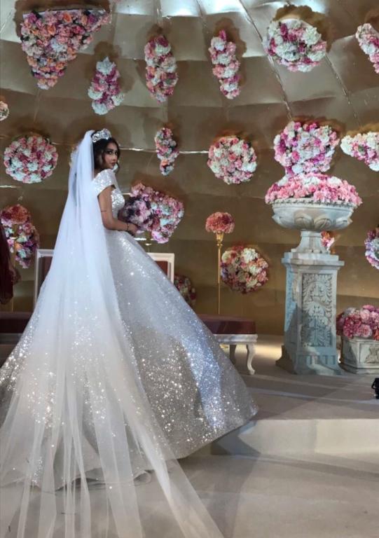 وتألقت فرح بفستان زفاف مستوحىً من أميرات الأفلام الخيالية باللون الفضي البراق زينته بطرحة وتاج، فيما بدت الرومانسية والانسجام التام بينهما.