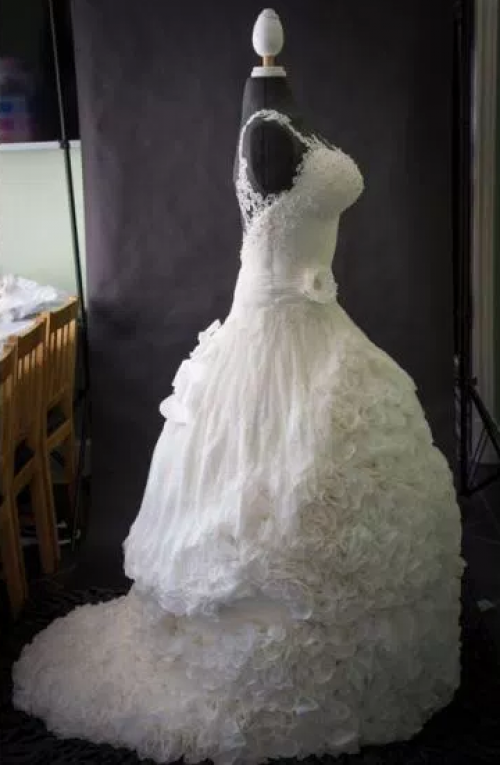 قد يظن من يرى هذا الفستان للوهلة الأولى أنه فستان عادي مصنوع من القماش ومزين بأجود أنواع الأقمشة، إلا أنه في الحقيقة مصنوع بالكامل من كريمة تزيين الحلويات والكيك.