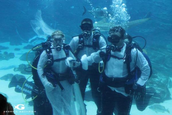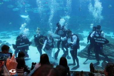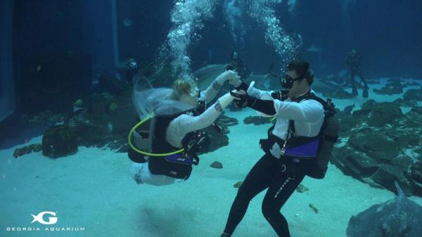 في حدث غريب من نوعه أقام عروسان من ولاية جورجيا الأمريكية حفل زفافهما تحت الماء في حوض أسماك.