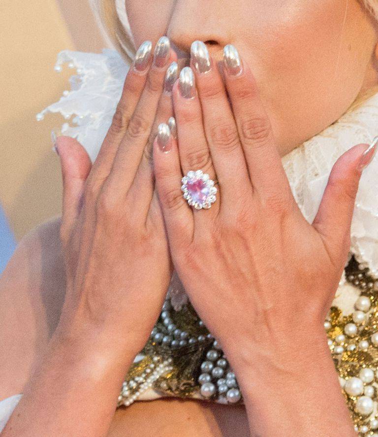 حيث تألقت ليدي غاغا بخاتم الخطوبة المصنوع من حجر من الماس الوردي المحاط بمجموعة من الأحجار الصغيرة الأخرى، وهو من السفير النادر في العالم و يزن نحو7 قيراط، و يحتوي على نحو 4 قيراط من الألماس.