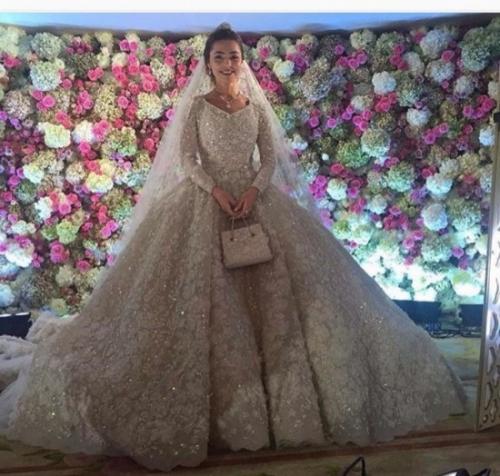 واختارت العروس فستاناً من تصميم المصمم العالمي إيلي صعب كلف حوالي مليون دولار.