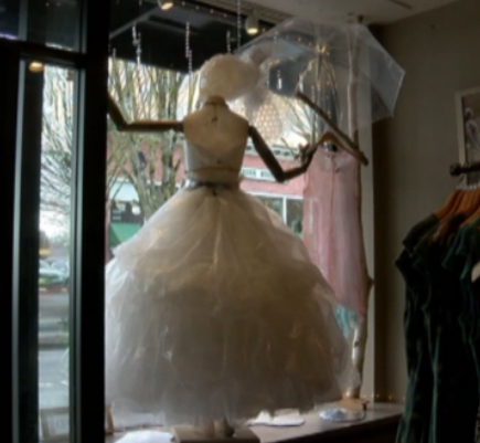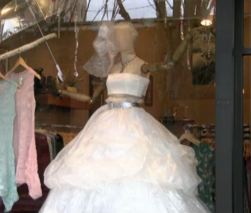 عرض متجر لبيع الألبسة في ولاية أوريغون الأميريكية فستان زفاف مصنوع من أكياس التغليف البلاستيكية والتي تحتوي على فقاعات هوائية وتستخدم لتغليف الصناديق على نافذة المتجر.