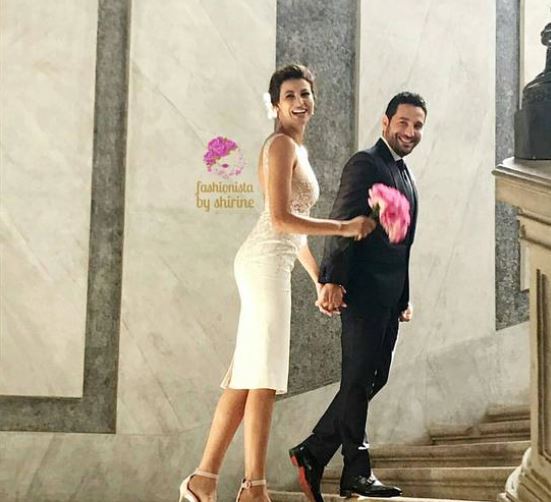 وكان الفستان من تصميم المصمم اللبناني العالمي جورج حبيقة باللون البيج، وحملت العروس باقة ورد زهرية اللون.