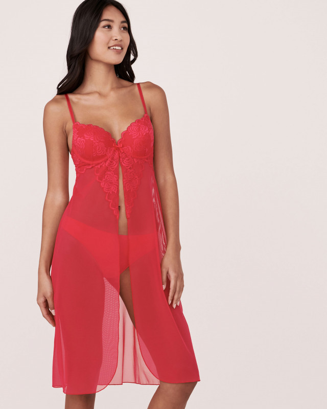 قميص نوم أحمر ناعم مع فتحة أمامية من لا في ان روز، مثير ومريح في نفس الوقت ويعد من أجمل ملابس داخلية مثيرة للعروس.