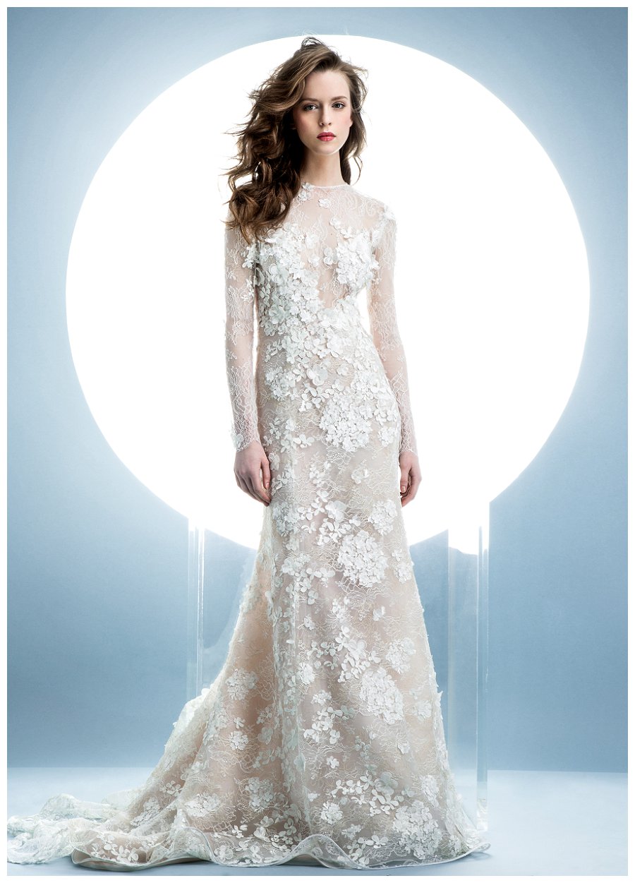 فستان زفاف من مجموعة "مونتريال" من تصميم نعيم خان لربيع 2016: يعد فستان الزفاف هذا المصنوع من الدانتيل وبقصّة الـ A Line، مثالي لعروس حالمة ترغب بإطلالة كالأميرات، فهو أنيق وساحر وخاصةً مع ياقة السويت هارت والكثير من زينة الأزهار.