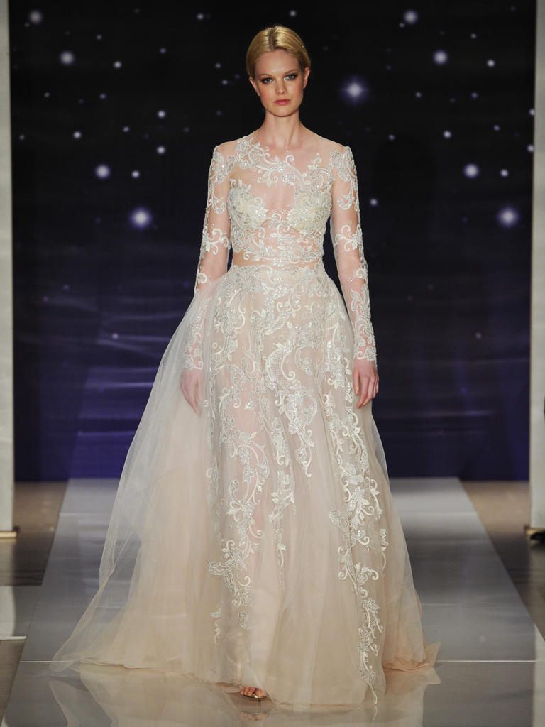 فستان زفاف من مجموعة ريم عكرا لربيع 2016: فستان الزفاف الساحر من تصميم ريم عكرا مستوحىً من القصص الخيالية! مع الأقمشة الشفافة التي زينت الياقة والظهر، بالإضافة إلى زينة الدانتيل الأنيقة، مما يجعله الفستان المثالي للعروس الرومانسية.