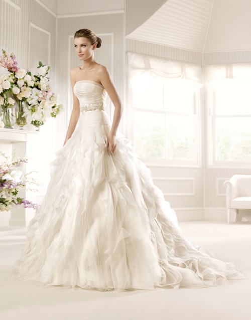 يعرف لاسبوزا بفساتين الزفاف ذات الأقمشة الغنية مثل تول، التفتا والحرير الطبيعي.