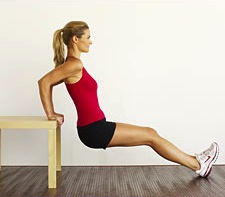 اجلسي على حفة كنبة أو دكة ويديك موازية لكتفيك، اتركي الجزء الخلفي من الجسم خارج الكنبة مع ثني الساقين ووضع القدمين بتوازي مع الأرداف، مدي ذراعيك مع تركها مثنية من منطقة الكوع، وقومي بثني الكوعين بهدوء واخفضي الجزء العلوي من جسمك حتى تشكل ذراعيك زاوية قائمة. احرصي على أن يكون ظهرك قريباً من الكنبة وذلك لتجنب نقل الثقل إلى الساقين. بمجرد أن ينتهي التمرين، عودي إلى وضعية البدء بهدوء.