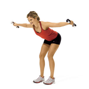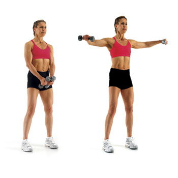 قفي بحيث تكون الساقين موازية للوركين واحملي دمبل في كل يد، اثني الكوعين قليلاً وارفعي الذراع من الجنب باتجاه الكتف، حافظي على الذراعين مرفوعين ومن ثم حركي الأثقال باتجاه الجزء الأمامي من الجسم مع مد الذراعين، كرري نفس الحركة لتعيدي الذراعين إلى الجنب، ومن ثم اخفضيهما لتعودي لوضعية البدء، كرري التمرين عدة مرات.