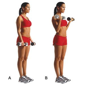احملي دمبل في كل يد في حين تكون راحة اليد مواجه لك، قفي باستقامة وقدميك موازية للأرداف وشدي عضلاتك بينما تضعين الدمبل أمام الفخذين، شدي العضلة الأمامية واثني ذراعيك بينما تحركين الدمبل باتجاه الكتفين، حافظي على الكوعين إلى جانبك ولا تحركي جسمك لمساعدتك في حمل الوزن، اخفضي الأثقال بهدوء لتعودي لوضعية البدء مع ثني الكوعين قليلاً.