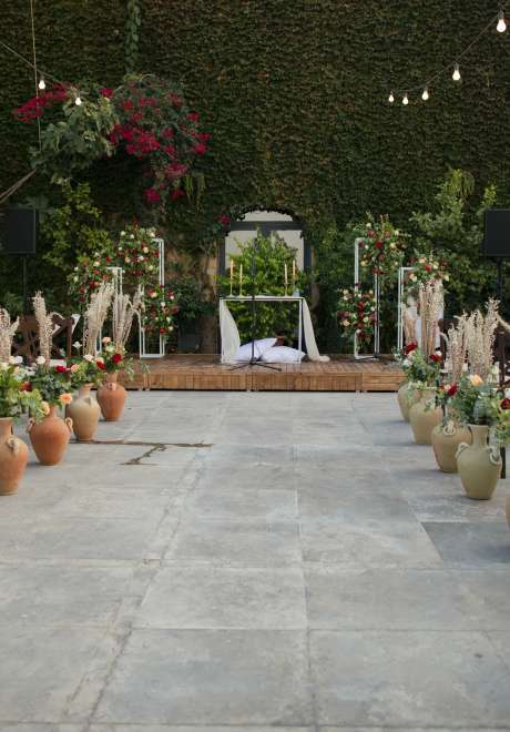 حرص فريق آرك دايمينشونز على أن يكون حفل الزفاف أنيقًا، مع بساطة وراحة. تم استخدام طاولات مستوحاة من المزرعة والصناديق الخشبية المزينة بالشموع والرمان الأحمر، وكذلك الورود الحمراء والبيضاء مع مفارش خضراء لإضفاء المزيد من اللمسات الطبيعية على حفل الزفاف.
