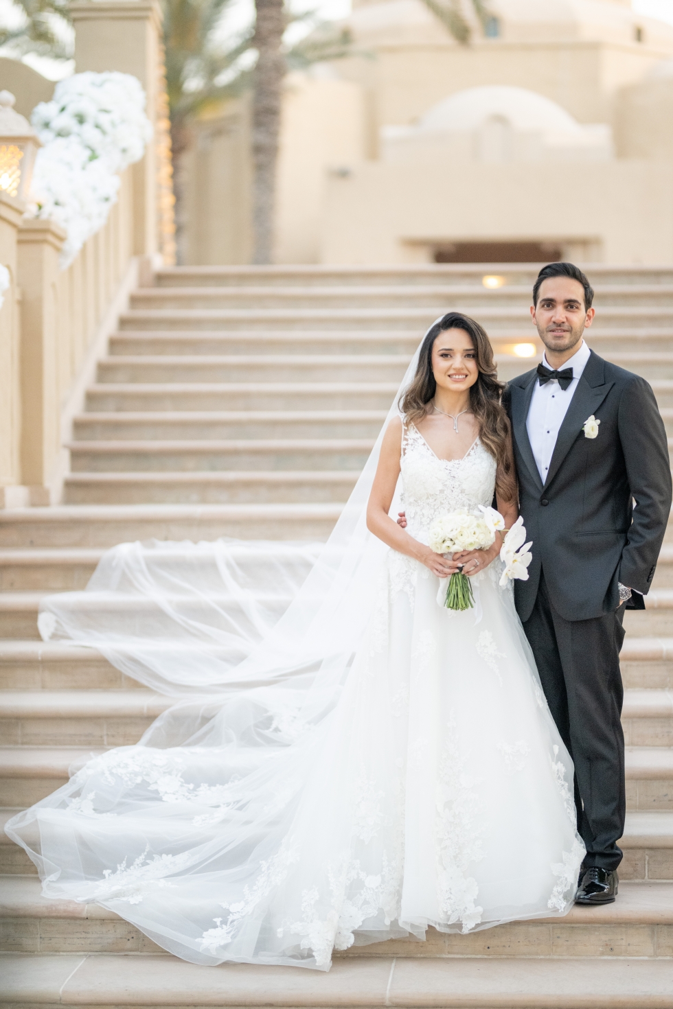 تألقت ياسمين في فساتين من تصميم روزا كلارا وفيرا وانغ، حيث كانت تشع اتزاناً وجمالاً في كل خطوة. كان حفل الزفاف عبارة عن حلم أبيض خيالي تحول إلى حقيقة، حيث اجتمعت الفخامة مع الإرث العريق، وكانت كل التفاصيل تنطق بالرقي. من الإطلالة الأولى إلى الرقصة الأخيرة تحت النجوم، كان احتفالاً لا يُنسى مثل قصة حبهما.