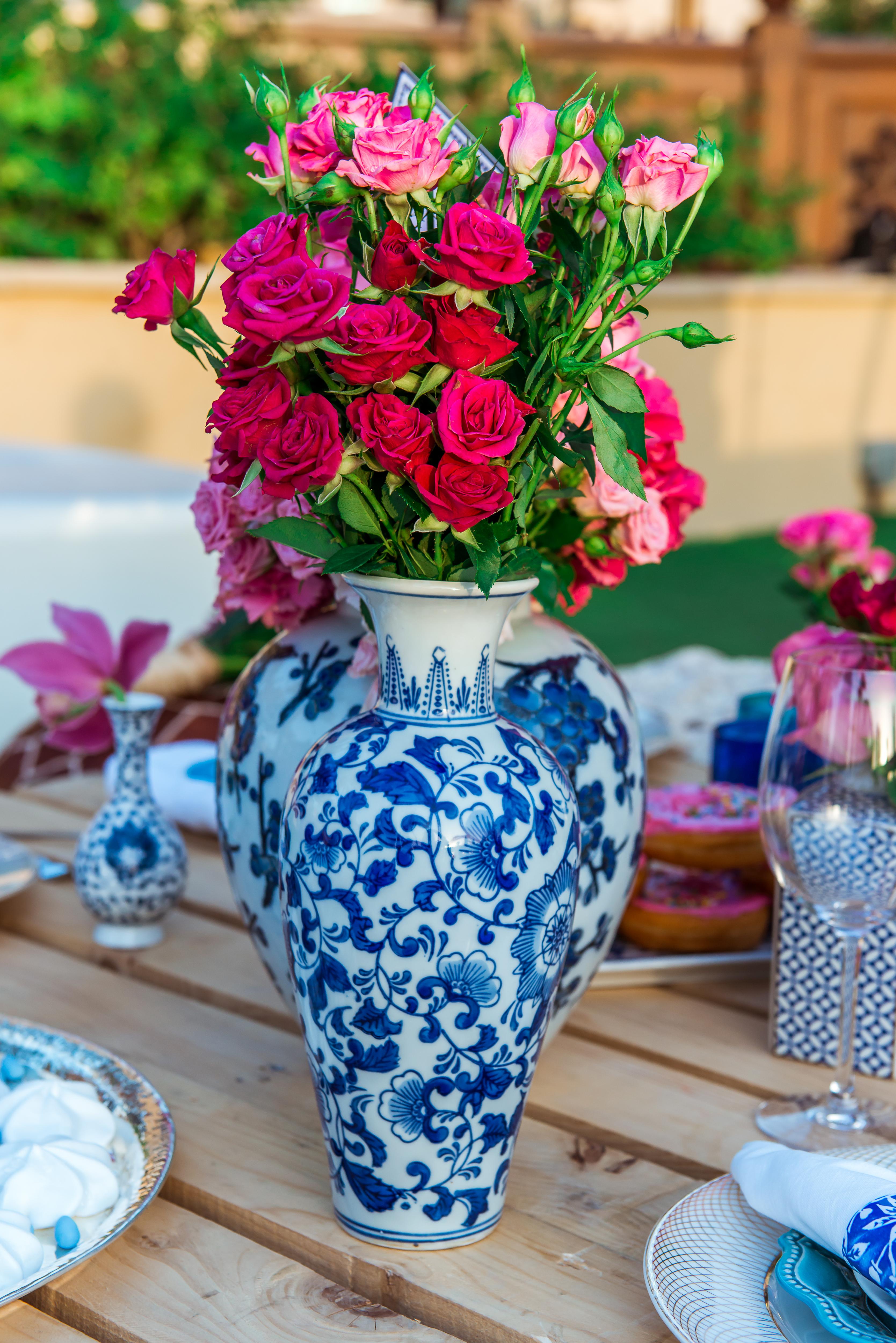 وقع الاختيار على اللون الأزرق في نقوش أطباق الطعام، وأزهار باللون الوردي النابض بالحياة والزهري، مما خلق ثيم حفل زفاف ساحر.