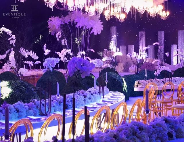 This dreamy wedding took place at the Arraya Ballroom in Kuwait, planned by the amazing team of Eventique, they transformed the wedding hall into a radiant area marked by dozens of magnificent columns, which included ropes from thousands of pieces of crystal Shwarowski delicate and shiny.