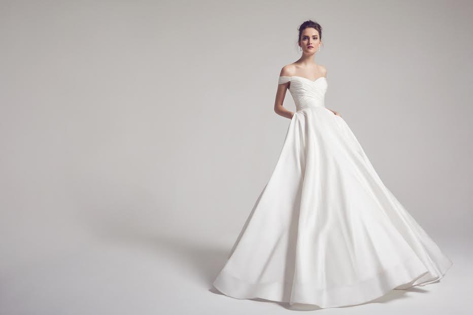 It starts with a stunning off the shoulder neckline of rouched silk satin chiffon. The center is a flattering natural waistline which meets a voluminous ball gown skirt made of Italian Silk Kalika, so luxurious to the touch. The skirt has side seam pockets and ends beautifully with a chapel train. You will definitely wow everyone for years to come, it is simply put. Timeless.