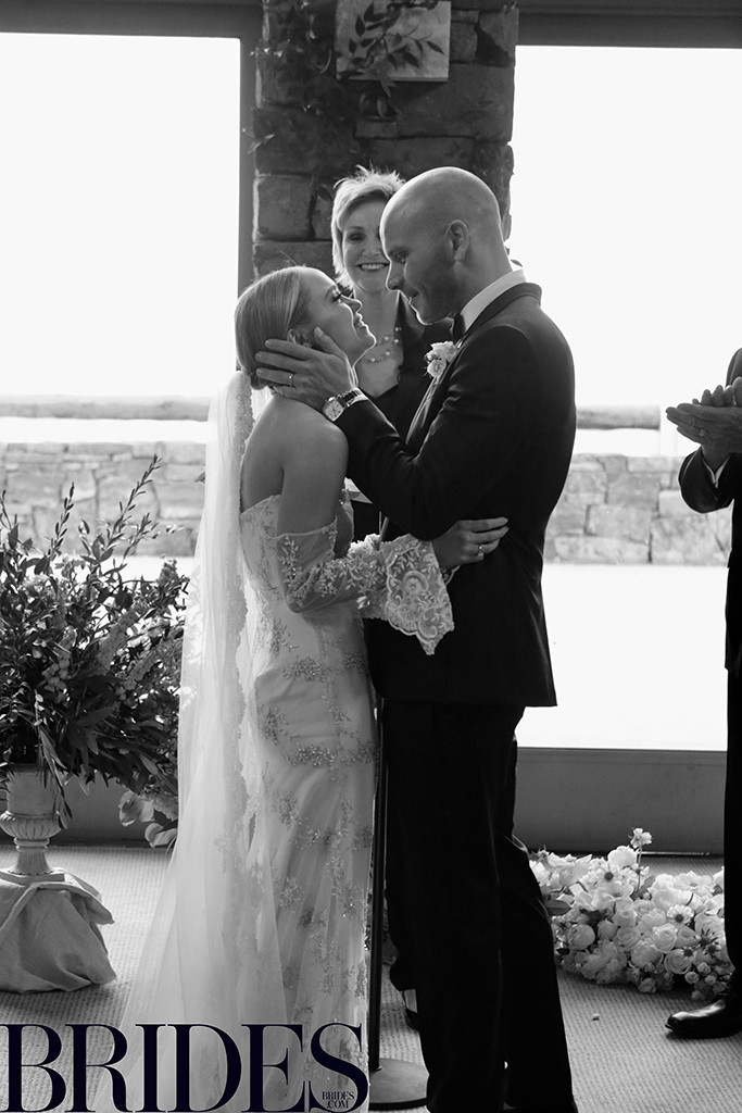 Becca walked down the aisle in a strapless, embellished Odylyne the Ceremony wedding gown and a lace-trimmed veil, according to Brides.