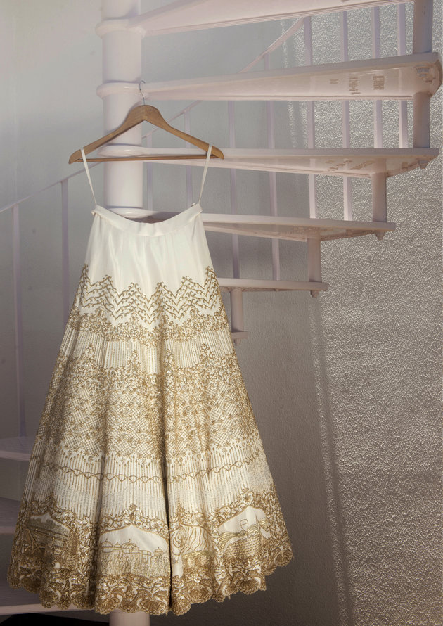 One of the most striking pieces she created for the occasion was a wedding lehenga, or long skirt, which she embroidered with their love story.