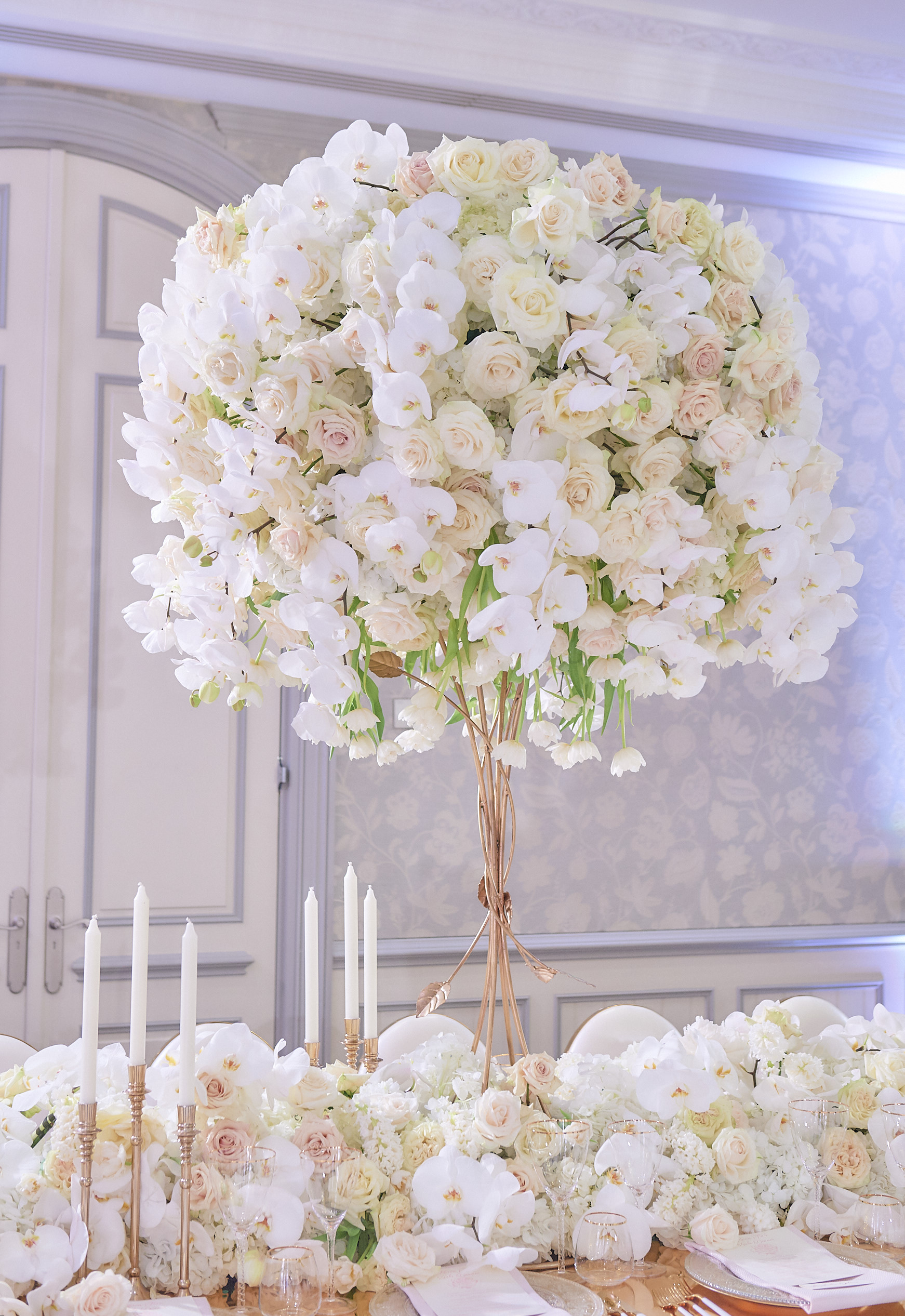 The floral tunnel and archway of beauty that framed the middle of the River Room stood at an impressive 14 feet tall and 18 feet wide and was a sight to behold. Decorated with a flower carpet made up of thousands of roses, hydrangeas and orchids, there were also similarly decorated flower walls and even the pillars were dressed with incredible flower cascades.