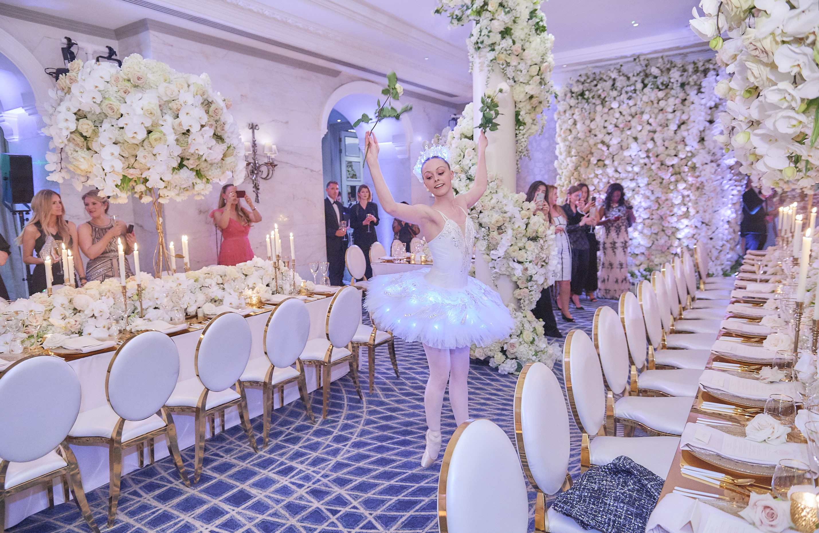 During the cocktail hour guests were entertained by performances by Dream Performance and ballerinas from Sophie Adams Ballet Company. Karen was warmly applauded and cheered as she made her entrance into the room wearing Galia Lahav from Brown's Bride and jewellery from Boodles. The guests were then welcomed and all the partners thanked in speeches by Jane and Karen.