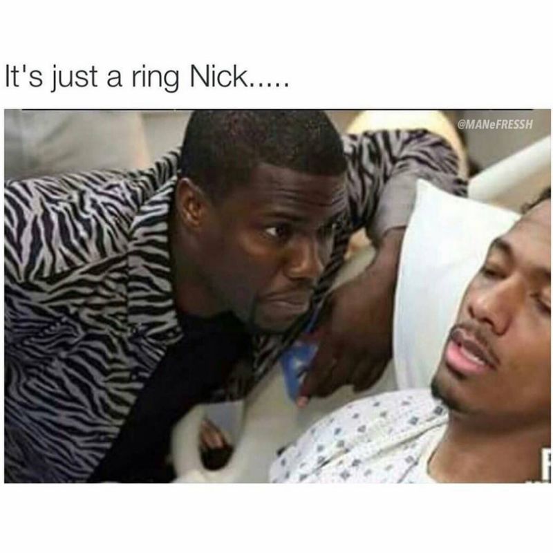 Cannon shared a fan-created meme that shows him on a hospital bed with Kevin Hart by his side. The photo, which was taken from their BET faux-reality show, Real Husbands of Hollywood, reads "It's just a ring Nick..."