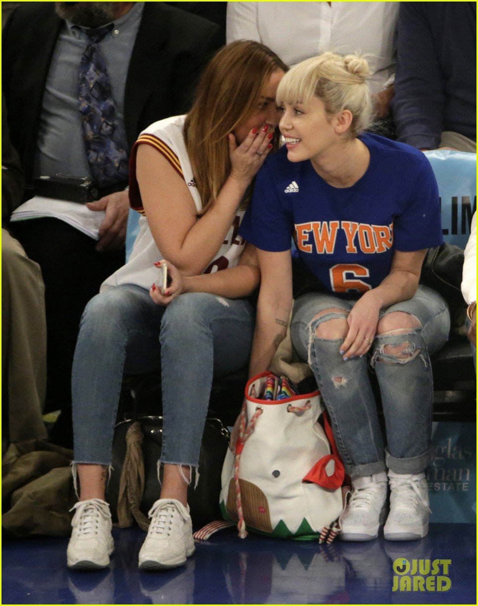 Miley Cyrus showed her support for the New York Knicks on Saturday evening by attending the game with her mother Tish, sister Brandi and their friends at Madison Square Garden.
