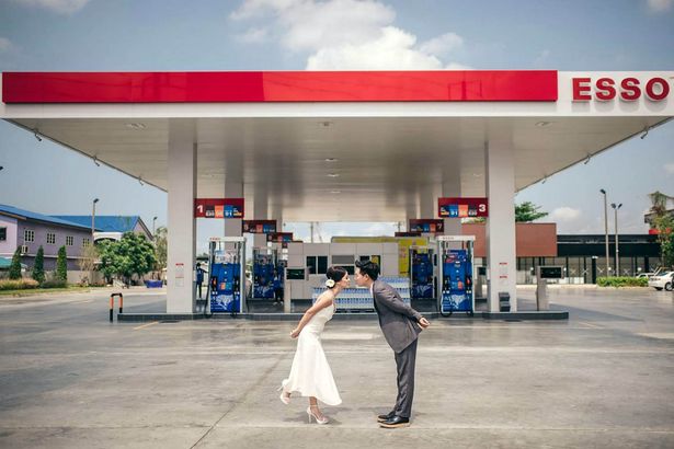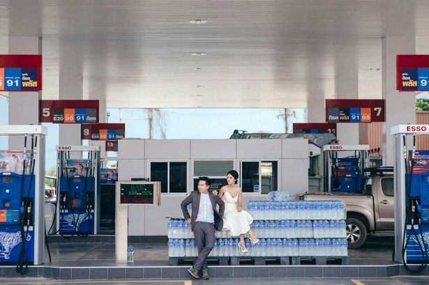 A Thai couple created a very unique photoshoot, as they got their pictures take at a gas station.