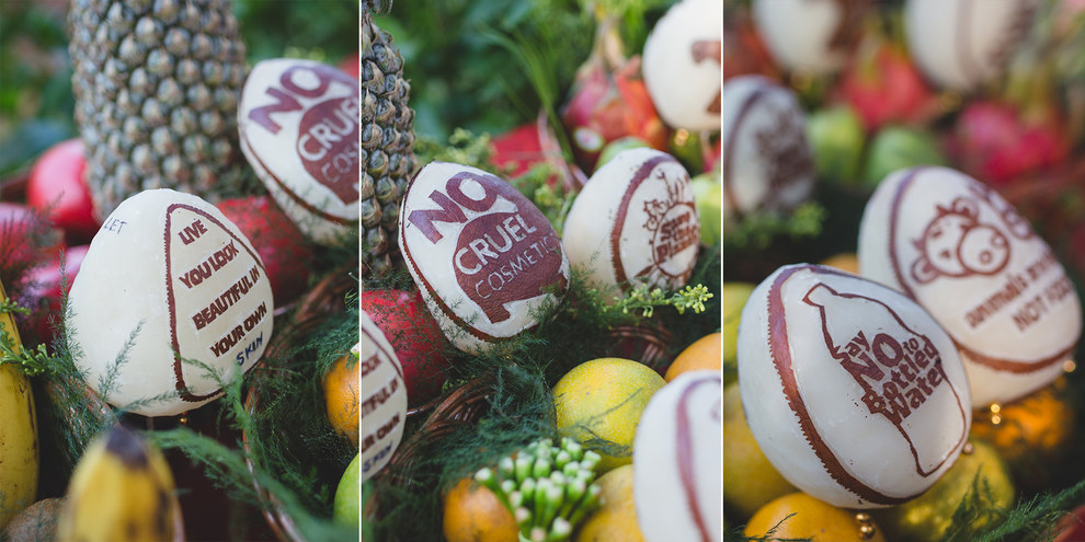 Other than not having flowers, the decor included messages carved on dry coconuts.