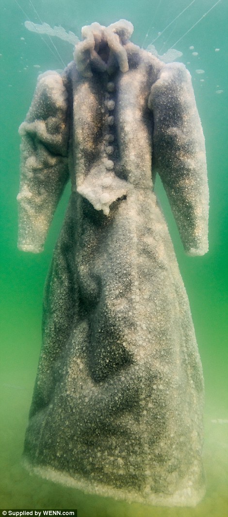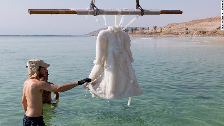 Over three months, salt crystals formed on the gown and gave the dress the appearance of being covered in diamonds.