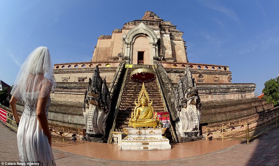Pavlina took a trip around the world after her marriage ended, and photographed herself at iconic sites wearing her wedding dress.