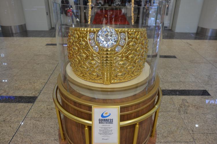 The 21-carat Najmat Taiba, which has been recognised by the Guinness Book of World Records and endorsed by the World Gold Council, weighs almost 64 kilograms (141 pounds) and is studded with 5.1 kilograms (11 pounds) of precious stones and diamonds, as well as 615 Swarovski crystals. 55 jewel smiths worked for 10 hours a day for 4-5 days to craft the ring, which is owned by Dubai-based company Taiba and has been put on display by RossellaJewellery.