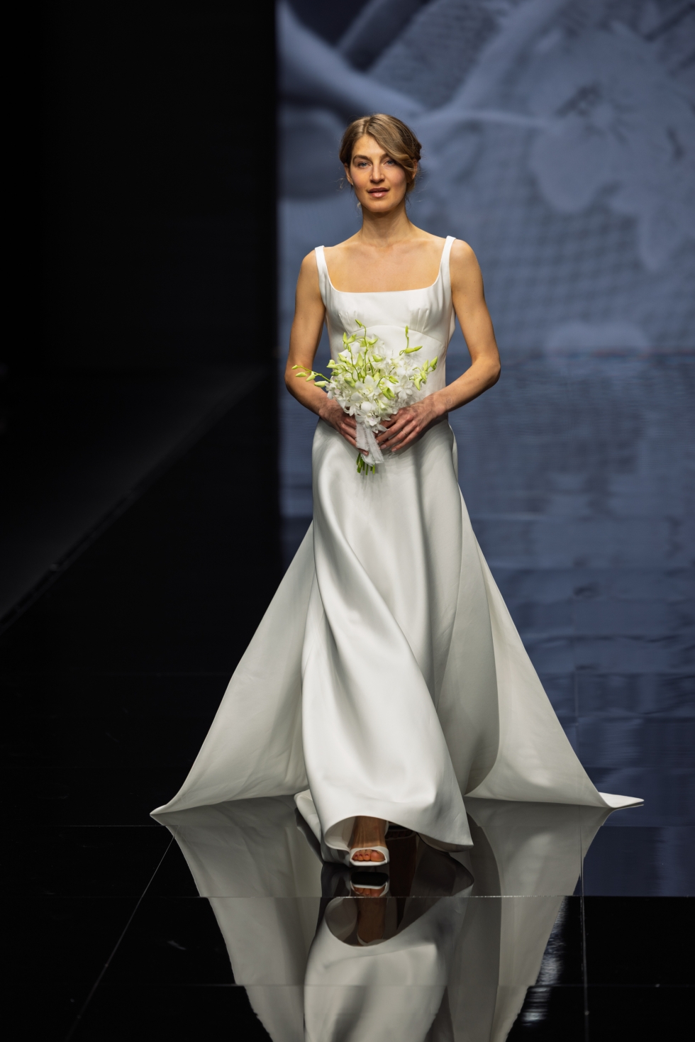 It is here—among hand-shaped drapery on the mannequin, invisible stitches, and lines sculpted with precision—that fabric becomes a masterpiece, enhancing the architectural structure of the gowns and the dialogue between material and form.