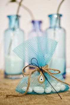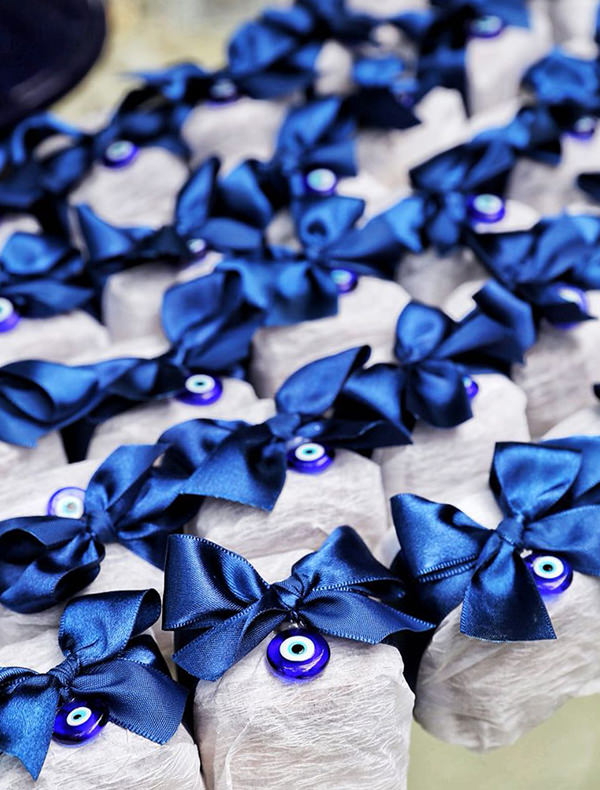 Have pretty bombonieres filled with candy-covered almonds wrapped up with white tulle and attach an Evil Eye to it.