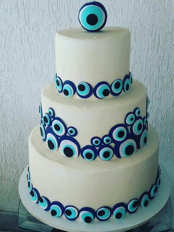 How about a beautiful wedding cake in white and blue? Perfect for your Evil Eye wedding theme! Or have Evil Eyes on your wedding cake as well for a bold wedding cake look!