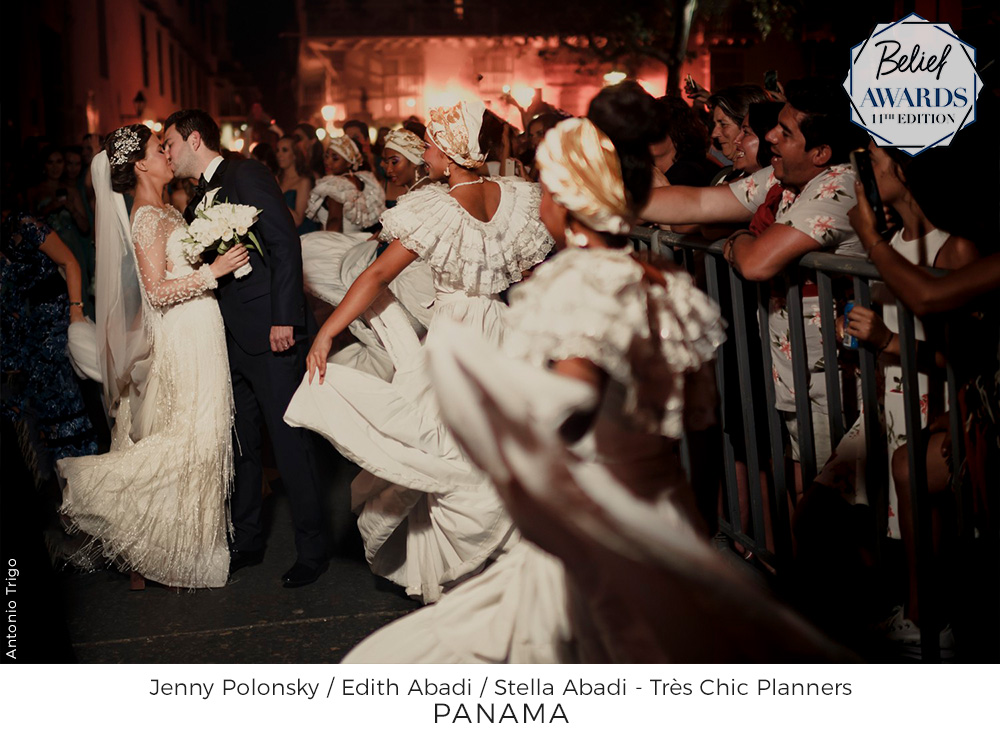Panamanians like very elaborate, elegant lots of food and drinks all night long party, where you can eat, drink and dance until the sun is up again. This was a 500-guest wedding. The awarded photo shows the moment that the couple was walking towards a historic plaza for photography and the sparklers made this beautiful scenario.