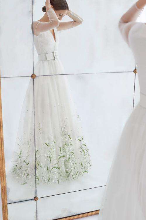 In her 2018 bridal collection, you will see a lot of floral touches, which were included in white on white wedding dresses and in different colors as well. The bridal dresses included emerald and white embroidery in a pattern inspired by an 18th-century men’s waistcoat, as well as blush-colored designs with guipure lace.