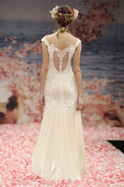 A vintage wedding dress with lace appliqués on the back, by Claire Pettibone