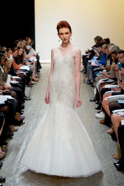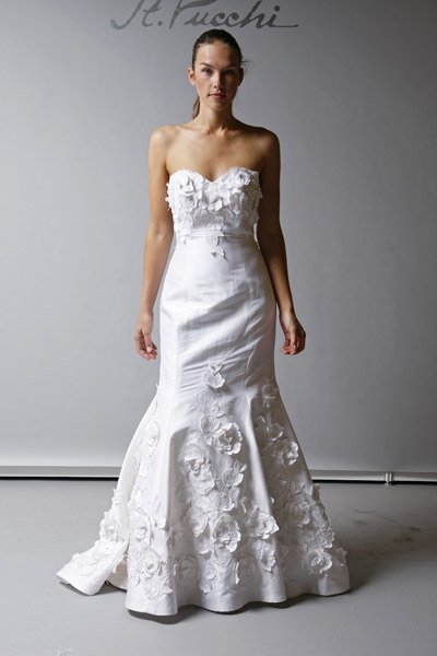 A glamorous wedding dress with floral beaded appliqués, by Ines De Santo