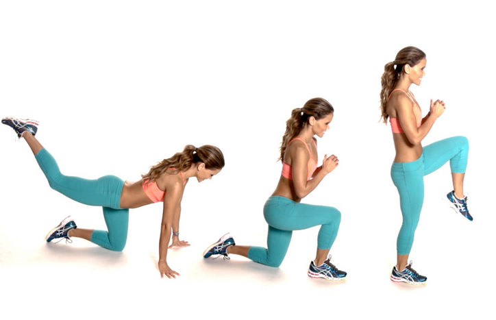 Pull yourself into a side plank, supported by your left knee, as you lift your left hip off the ground and raise your right leg and right arm. Move slowly, maintaining tightness in your core. Repeat 15 times on each side.