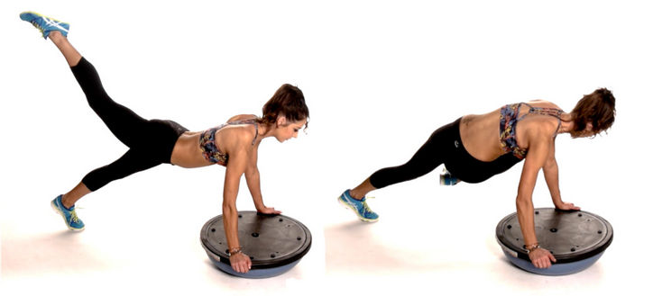 Get into a push-up position with your hands on either side of an upside-down Bosu Balance Trainer. Kick your right leg straight up behind you.