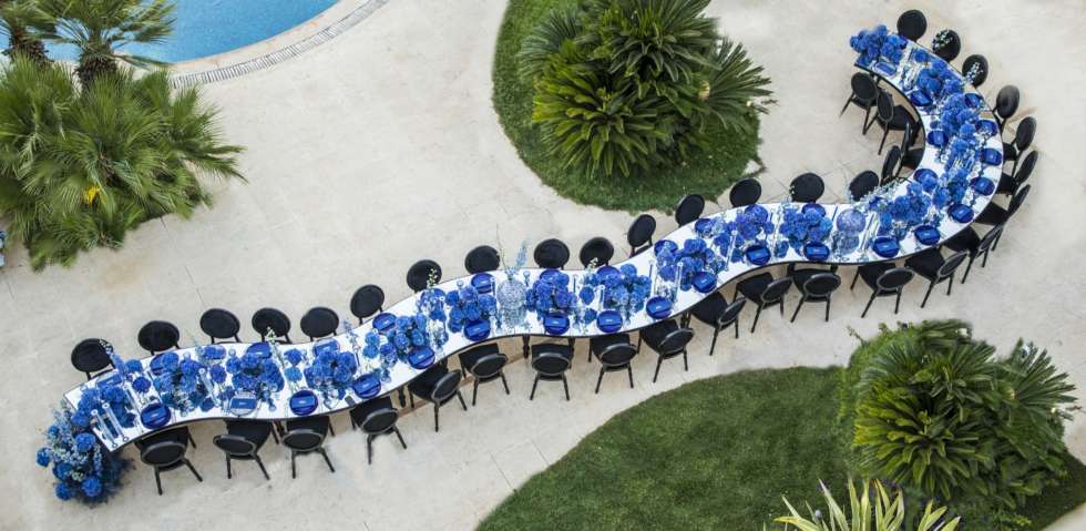 Just like this breathtaking setup by MyEvent Design for an engagement in Jordan, the team used beautiful black chairs, with mirror tables, and to add a pop of color they went for all blue flower arrangements. Click here to see more of this wonderful event!