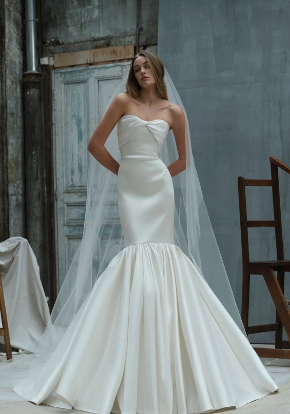From fluid tulle spaghetti straps that mimic marble to strapless sheaths that echo statues in silk, each piece blurs the line between fashion and art. Every look evokes both structure and softness, offering brides the ability to float, glide, and command every step of their day.