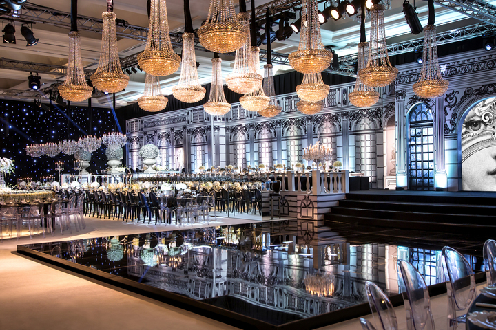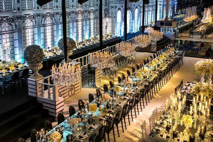 Adjoining the Versailles façade, the designers constructed a raised veranda that, in a clever trompe l’oeil, looked as if it was built onto the façade itself. running along the length of the veranda was a balustrade with more monumental urns – these ones planted with box topiaries that had been sprayed silver for a modern “royal garden” feel. A grand staircase swept down to the dance floor below – which had a black, high-gloss finish to reflect the palace behind and the lights of the sixteen ornate crystal chandeliers that hung overhead.