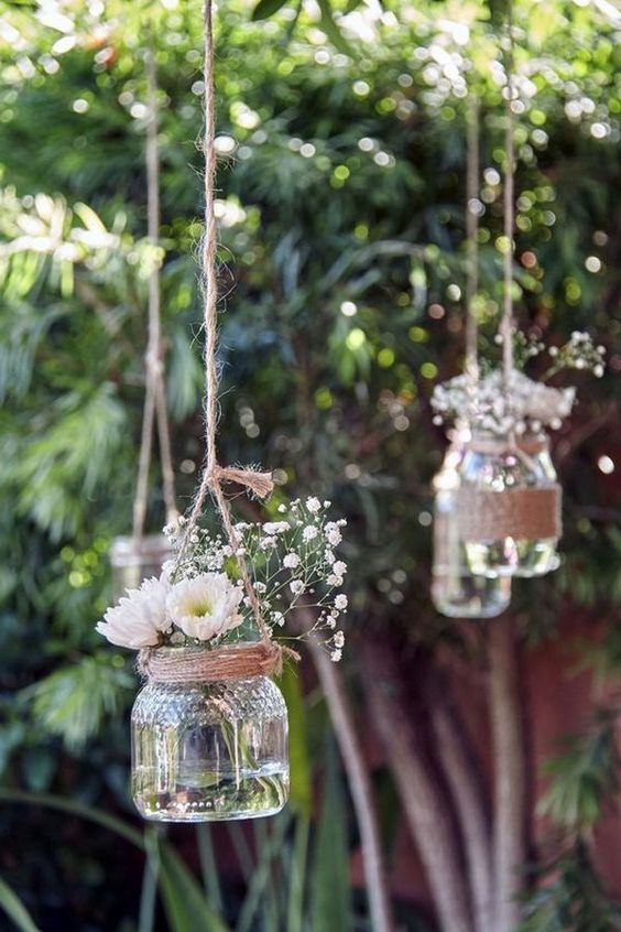 Mason jars have been popular for the past few years especially for outdoor weddings as they can be used in so many different ways, fill them with flowers for your centerpieces, hang them and fill them with candles or flowers as well, and even to serve your drinks!