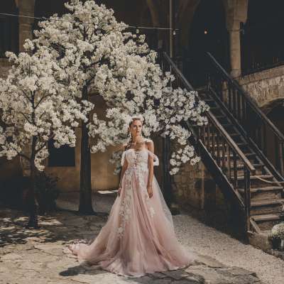 Ball gowns, wonderful line silhouettes in alençon lace, mini dresses to twirl at your party, embroidered tulle cascading on sheath dresses, long sleeves, and one-shoulder dresses, an explosion of detail and elegance.