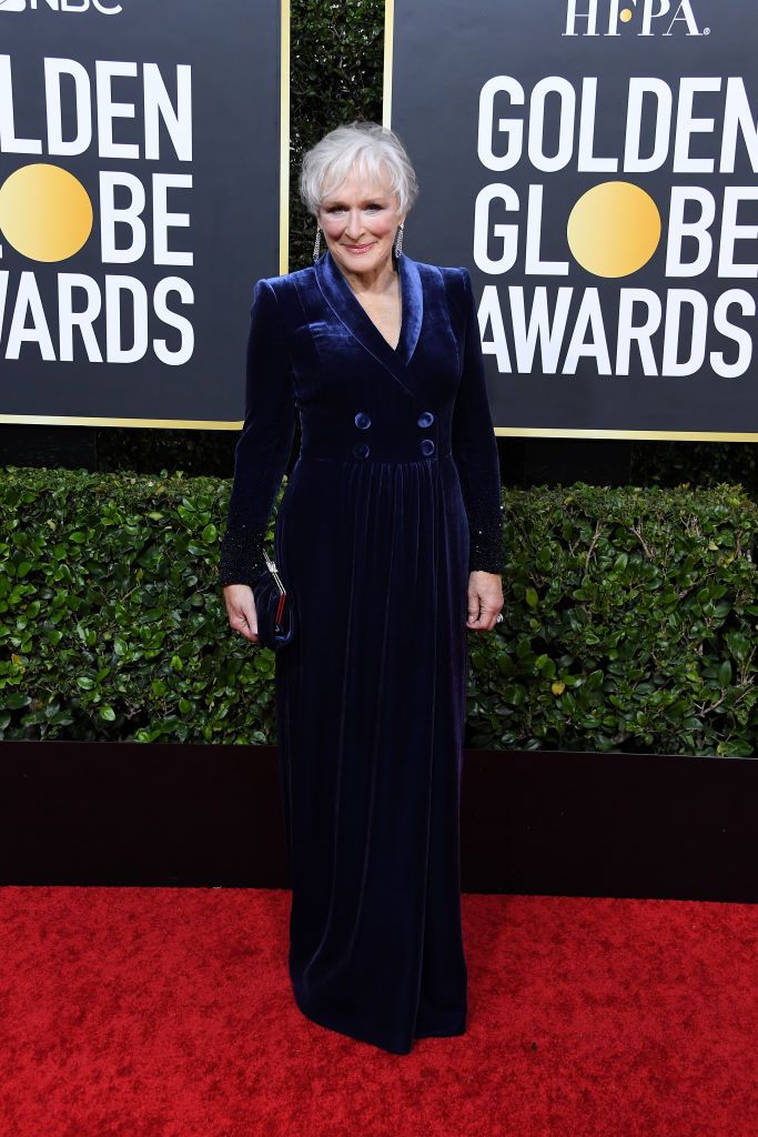 For a timeless look, Glenn Close chose a chic blue velvet blazer gown by Armani.