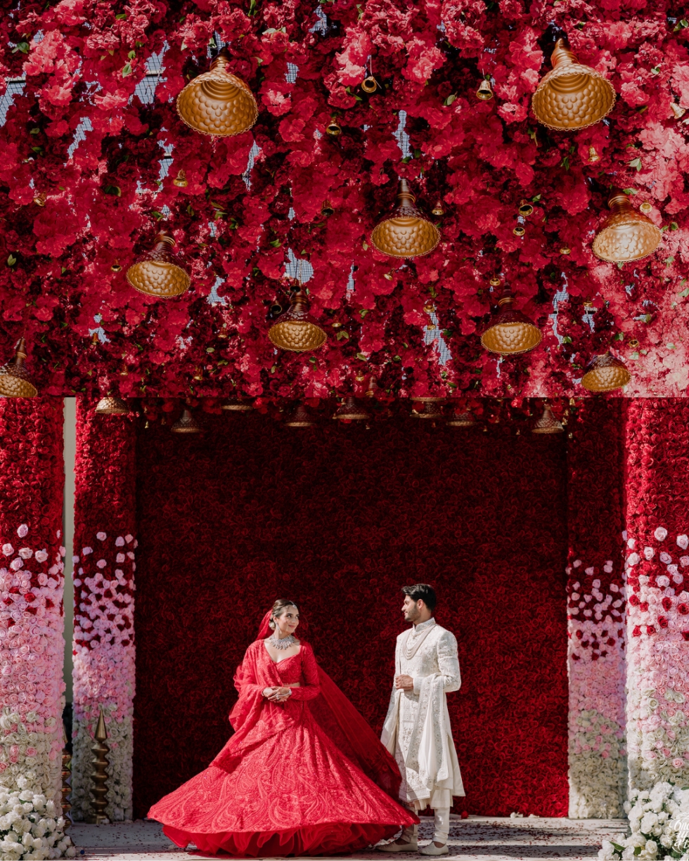 Architectural floral installations framed the mandap with elegance, echoing the soft-to-bold transition while balancing intimacy and grandeur. Their beloved Simba (Dog) walking down the aisle added a heartfelt personal touch, while curated experiences like a matcha station and live sketch artistry elevated the guest journey.